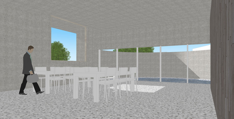 전면의 20M 도로에 접한 대지의 전면부를 넓은 보행광장으로 계획하여 지역 주민과 방문객 모두에게 열려 있는 열린 진입 공간을 제공한다. 보행광장은 단순한 진입부가 아닌, 건물의 중심 잔치마당으로 자연스럽게 스며드는 전환 공간으로서 기능하며, 방문객의 첫 경험을 환영의 장으로 확장시킨다. 중심부에 배치된 잔치마당과 수공간은 연구·실습동과 교육·관리동 사이를 유연하게 매개하며, 실내외의 경계를 넘어 시각적·심리적 확장을 유도한다. 이를 통해 음식의 따뜻한 기운, 사람 간의 소통, 자연의 풍요로움이 하나로 어우러지는 남도의 장소성을 담아낸다. 우리의 건축적 제안은 단순한 기능 배치에 머무르지 않고, 열림과 소통, 경험과 순환의 건축적 흐름을 통해 공공건축이 지향해야 할 문화적 태도를 구현하고자 한다.
