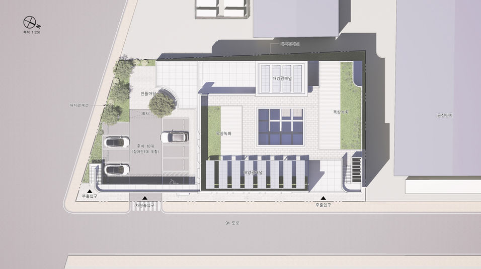 조선 산업의 거친 대지 위, 화원조선 청년문화센터는 노동의 시간과 휴식의 시간이 교차하는 경계 위에 서 있다. 밝은 벽돌과 콘크리트로 이루어진 매스는 산업의 무게를 품되, 그 속에서 부드러운 그늘을 만들어 산업의 풍경 속에 온도의 균형을 더한다. 중정을 통한 간접 채광은 거친 현장 속에서도 빛과 바람의 여유를 느끼게 하며, 청년 근로자와 지역이 함께 숨 쉴 수 있는 공간을 만든다. 이곳은 단순한 문화시설이 아닌, 청년의 삶과 지역의 시간이 맞닿는 사회적 쉼표이며, 산업의 풍경 속에서 사람과 공간, 오늘과 내일이 조용히 대화하는 청년의 시대를 위한 그늘의 건축이다.
